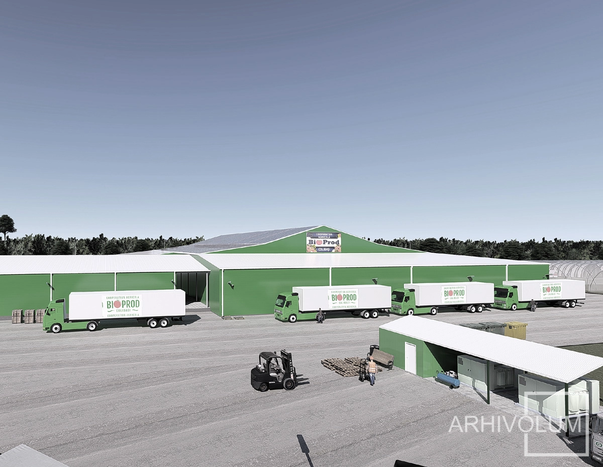 Constructia este proiectata conform temei dictate de catre beneficiar si îndeplinește functiuni de depozitare. Construcțiile sunt amplasate la marginea comunei, în proximitatea terenurilor agricole, iar lângă hale au fost propuse sere de producție legume.