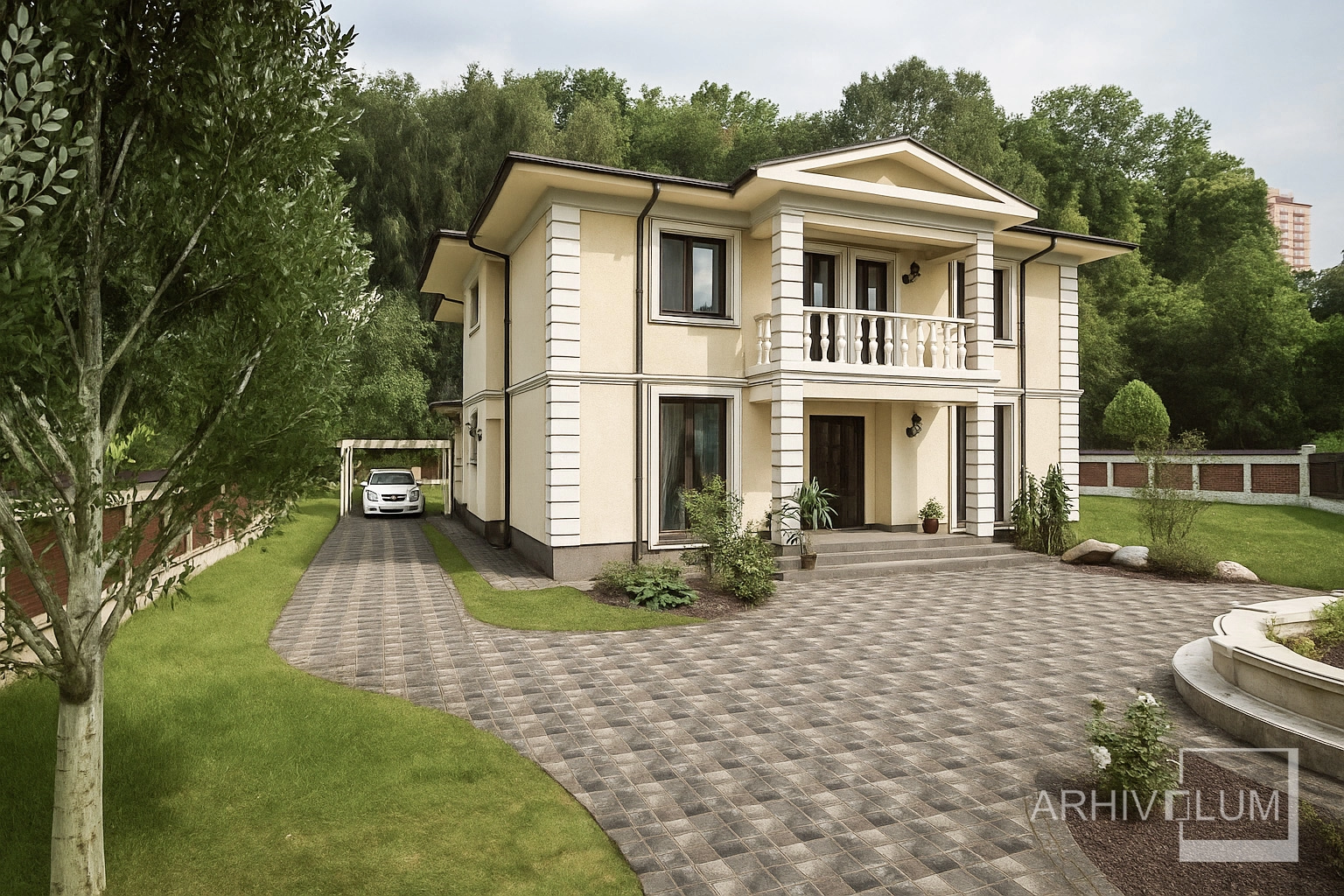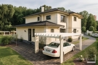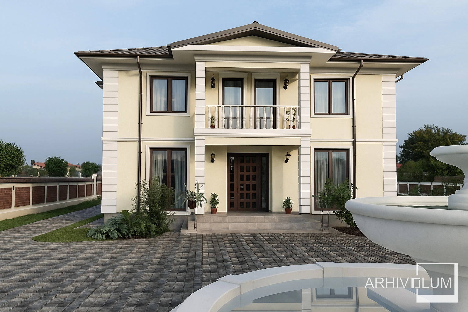 Fântâna arteziană rotundă, pe lângă rolul de dirijare a circulației interioare, nu face decât să accentueze stiul clasic al acestei amenajări din incintă. Vila de vacanță prezentată se poate implementa pe terenuri generoase de peste 700mp, terenuri cu pantă mică.