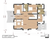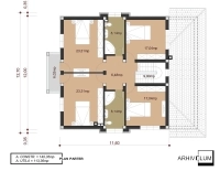 Intrarea în casă axată pe poarta de acces auto ne duce către holul central ce are cap de perspectivă o scara masivă cu finisaje scumpe specifice acestui tip de ahitectură. În partea dreaptă se dezvoltă zona de zi legată strâns de bucătărie, iar în partea dreapta avem zona de noapte cu acces dintr-un sas ce poate fi închis pentru sporirea confortului acustic. Etajul are patru dormitoare cu două băi mari de 8,14mp fiecare, iar cele două dormitoare din față au acces la o terasă acoperită. Șemineul din living, dar și soluția de centrală termică pe lemne dau posibilitatea de a amplasa construcția și în zonele retrase unde nu avem toate utilitățile.