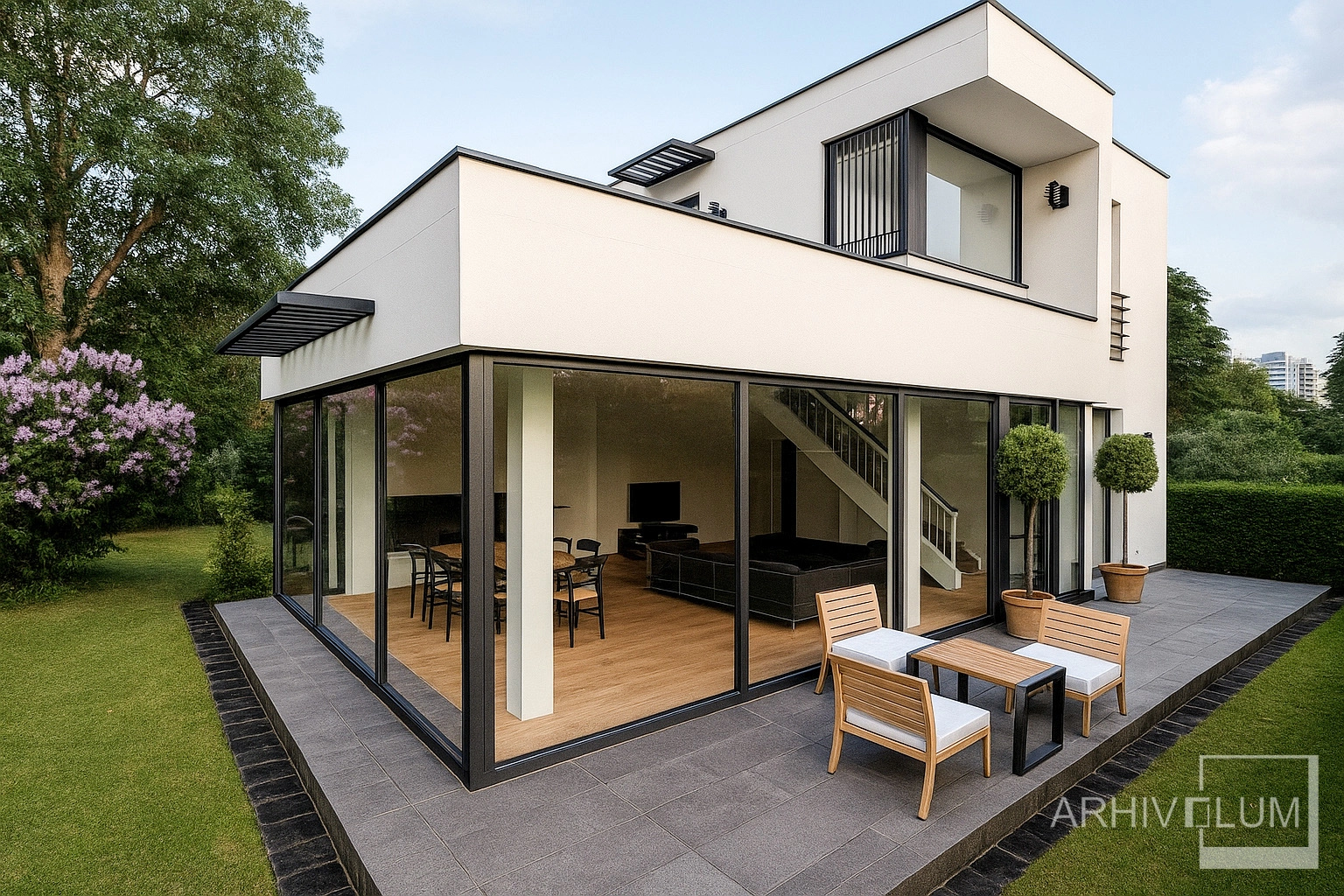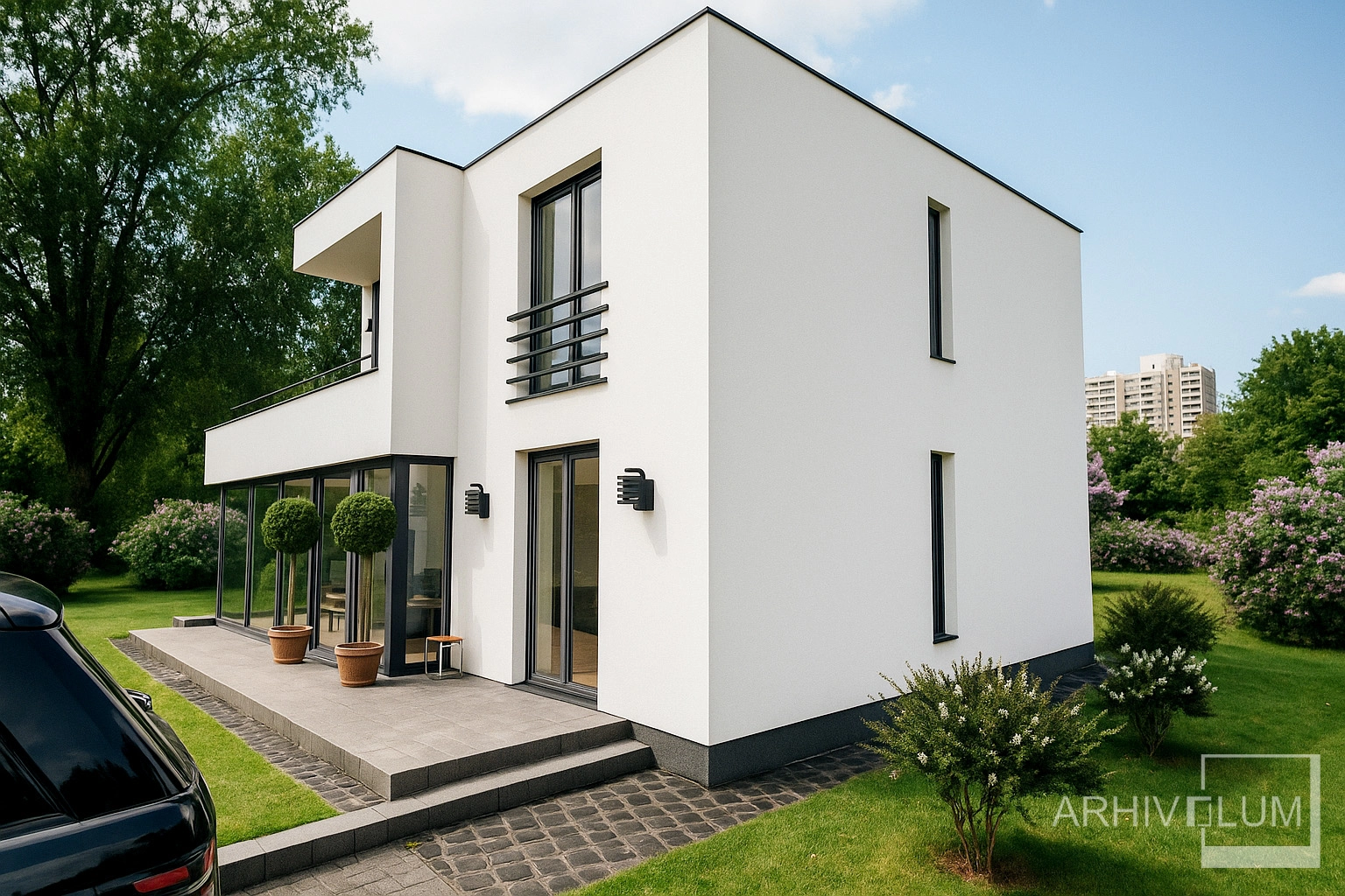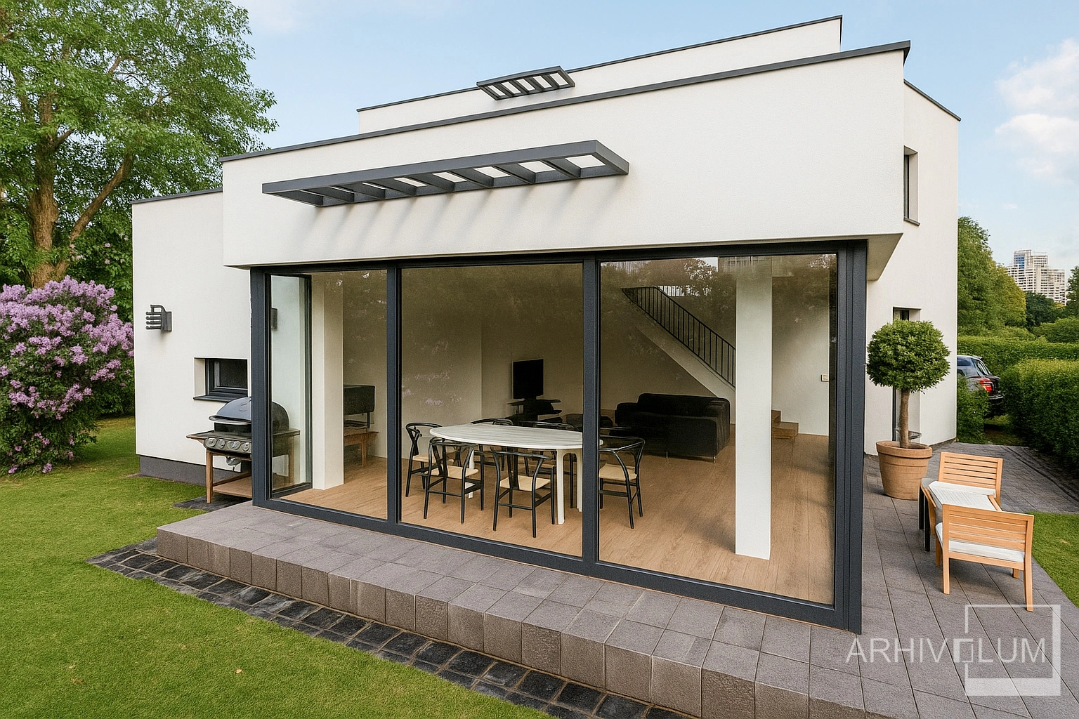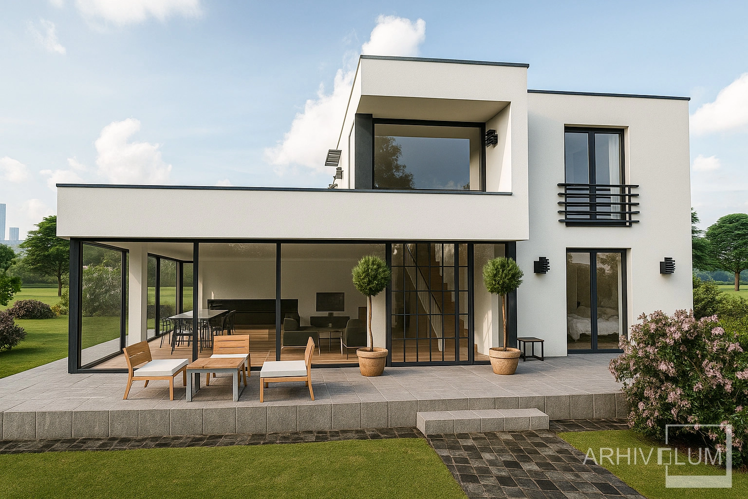O casă modernă înseamnă în primul rând o casă lumionoasă cu un living mare, cameră de zi organic legată de locul de luat masa și de bucătărie. Volumetria simplă dată de etajul parțial, acoperișul tip terasă circulabilă, spațiile vitrate din abundență cât și terasa primitoare din fațada principală încadrează acest proiect în zona locuințelor moderne actuale.