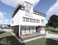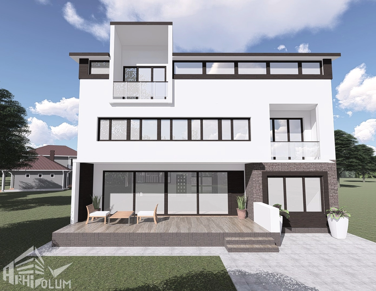 Terasa imensă, logiile interesante cât și coloristica materialelor exterioare sunt soluțiile alese cu beneficarul pentru a se oglindi această arhitectură modernă. Acest proiect este din anul 2006.