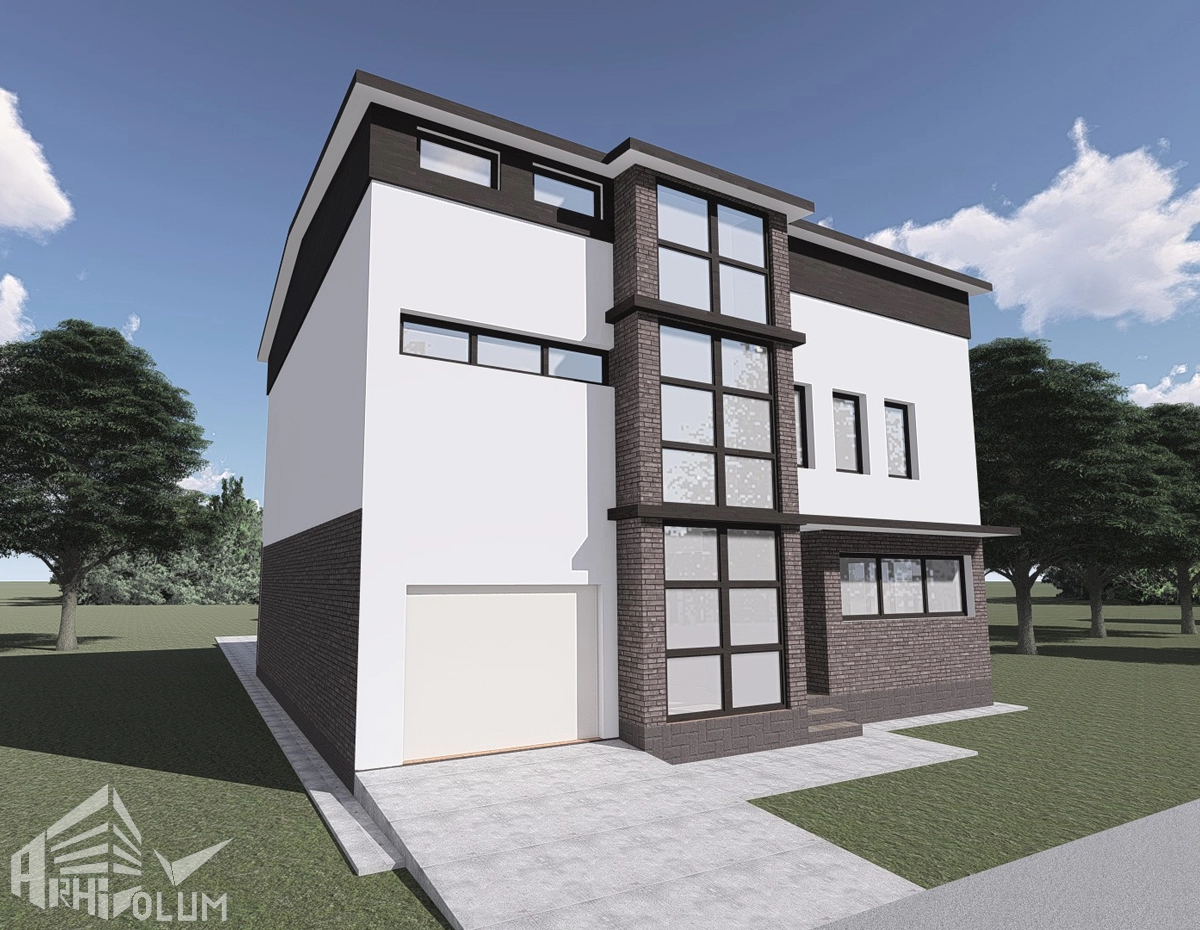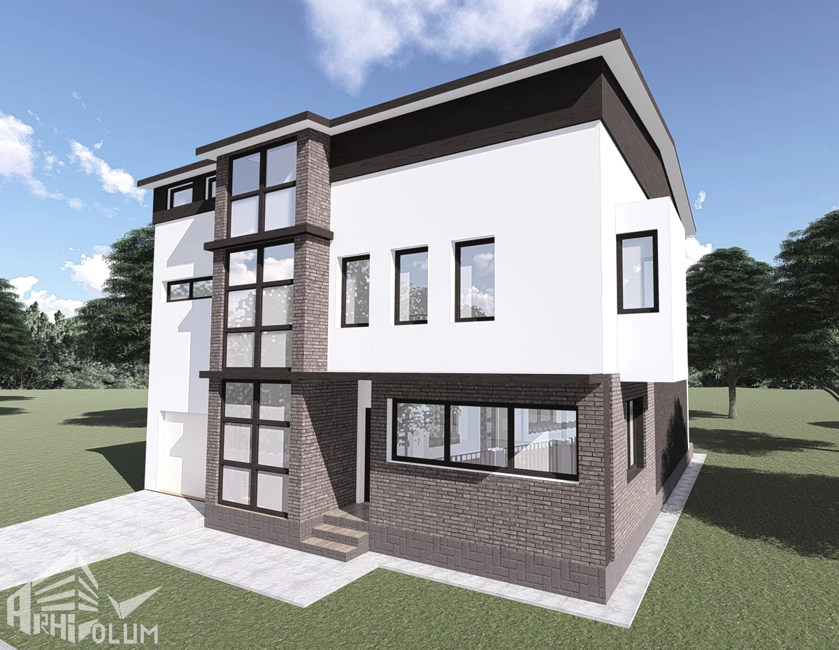 Accesul în casa se face central, intrarea fiind marcată geamurile mari ale scării. Parterul are un living deschis către curtea din spate, un birou și garajul cu acces din casă. Etajul este compus din 3 dormitoare și 2 băi generos mobilate.