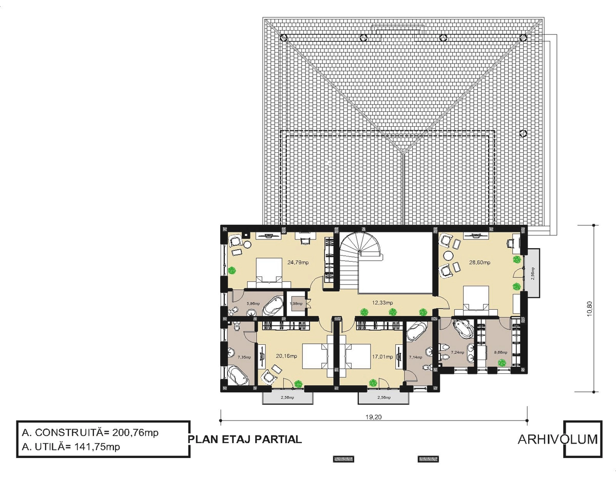 Etajul are în componență patru dormitoare cu suprafețe generoase, iar dormitorul matrimonial are baie proprie și un dressing mare care poate satisface orice exigență. Structura de rezistență simplă cât și acoperișul clasic în patru ape reprezintă o variantă de execuție relaxantă pentru orice constructor sau meșter.