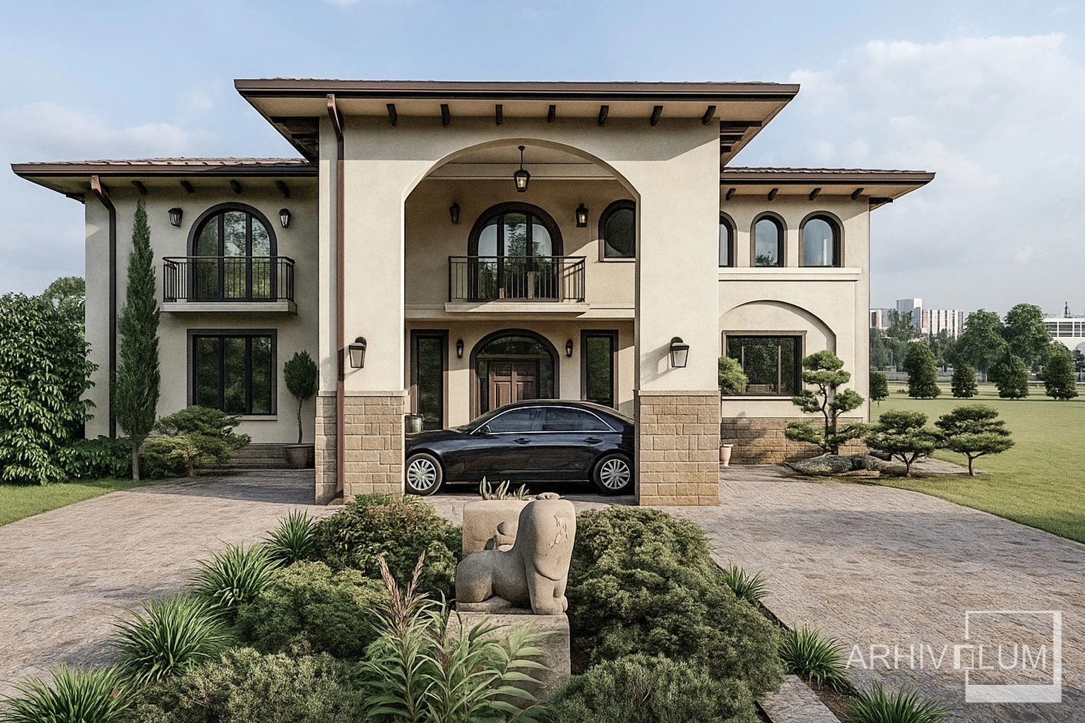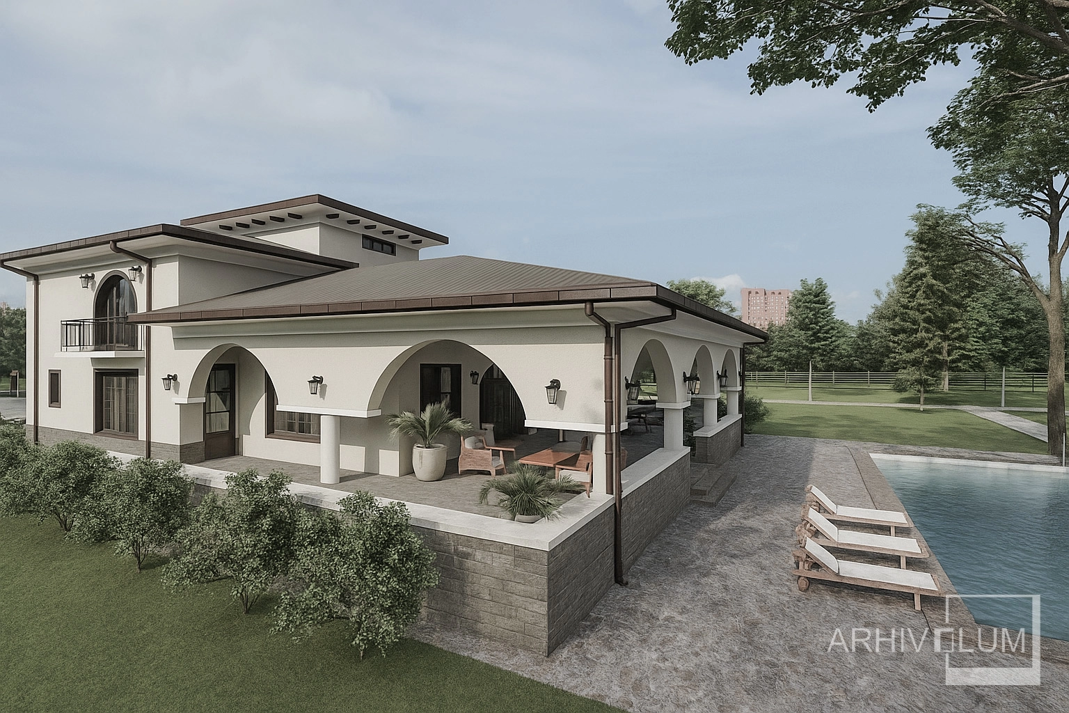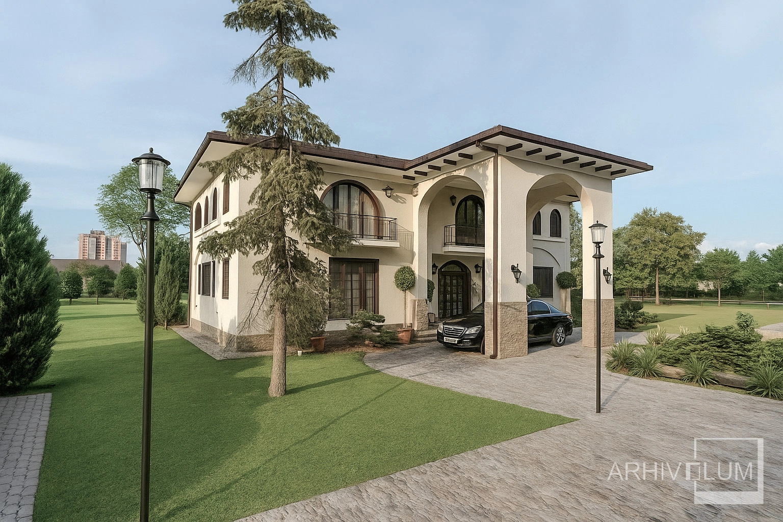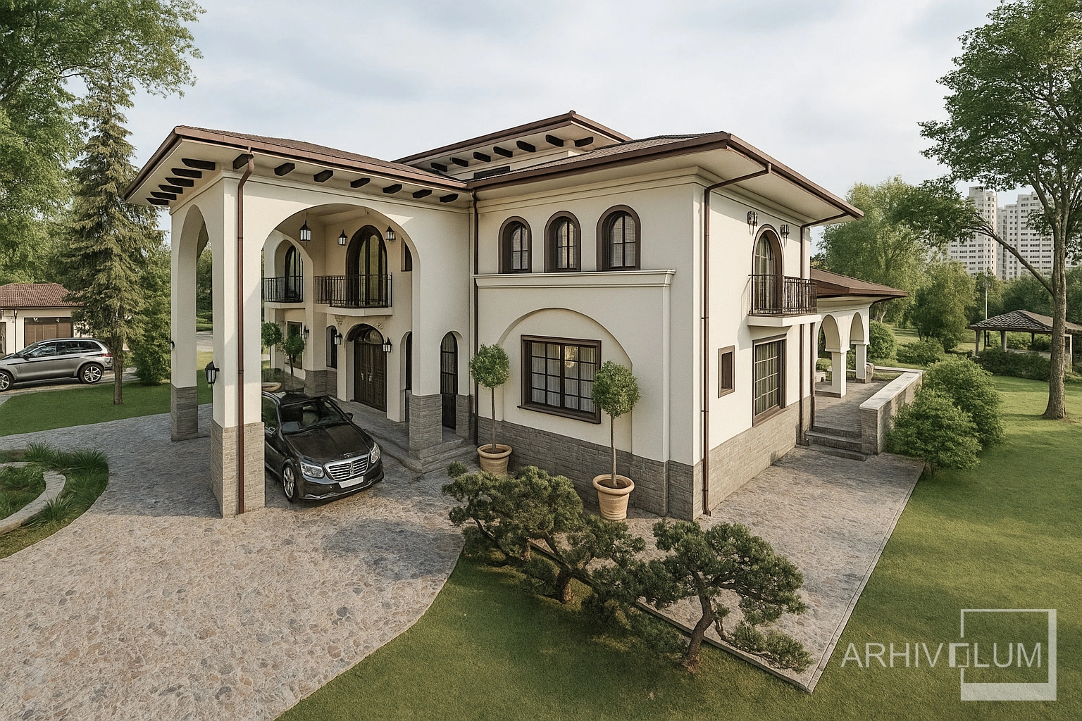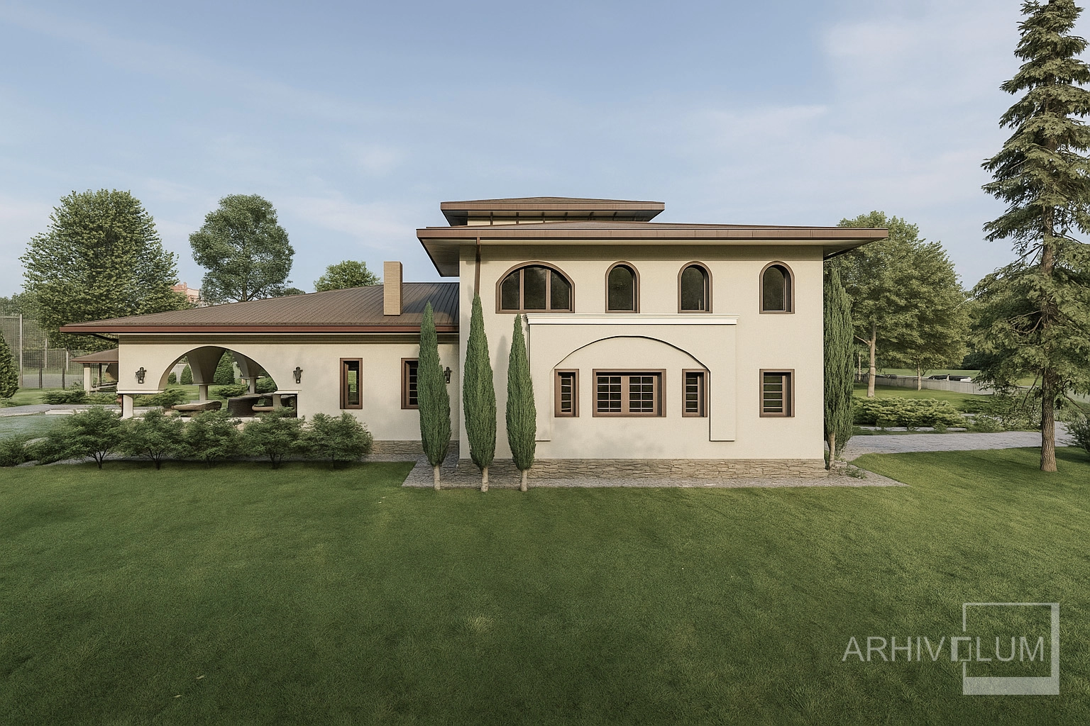 Această vilă cu o arhitectură care ne duce spre imaginea unui conac cu influențe mediteraneene a pornit din dorința beneficiarului de a rămăne la o soluție clasică privind aspectul locuinței. Simetria generală ruptă de zonele asimetrice ale parterului, cât și golurile cu arcadă întregesc această volumetrie echilibrată.