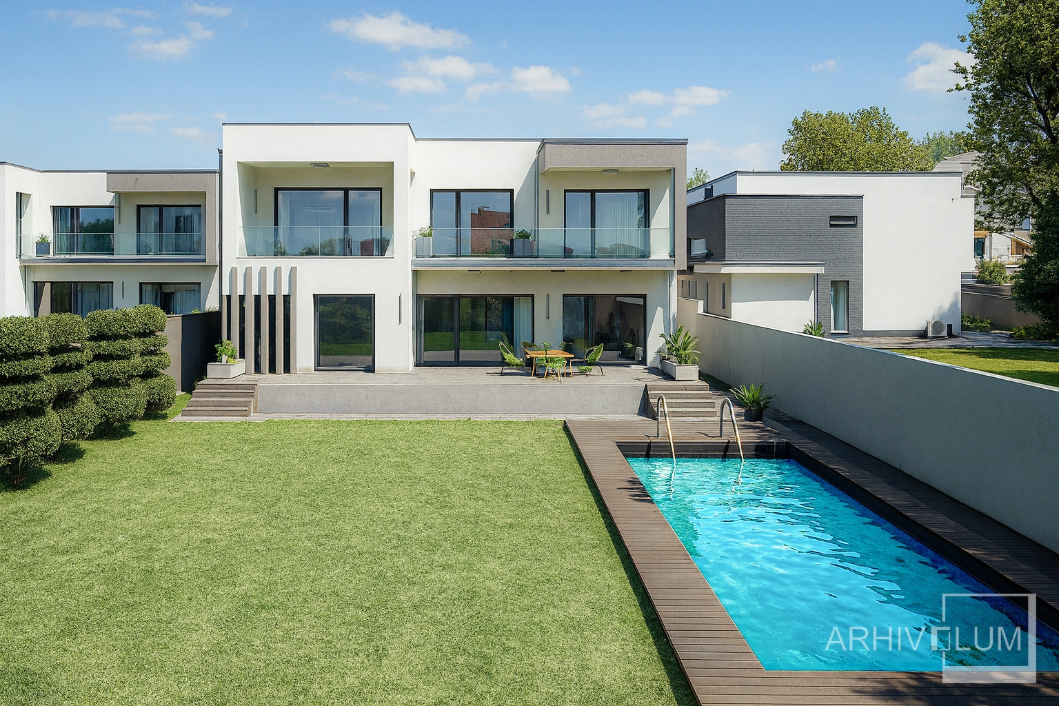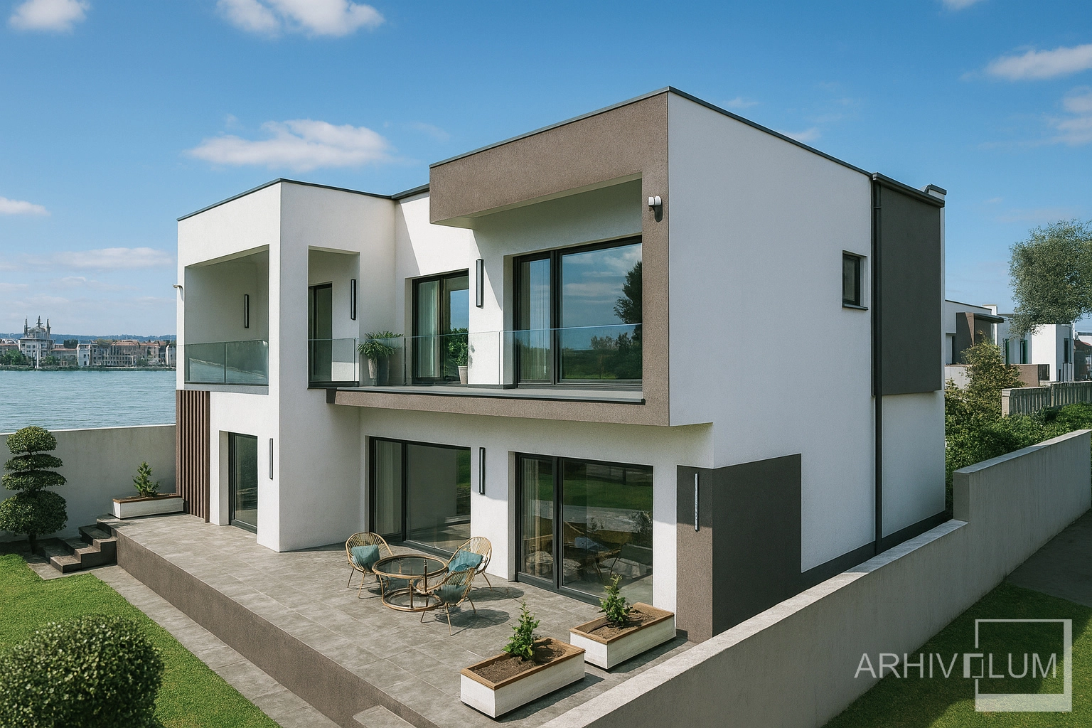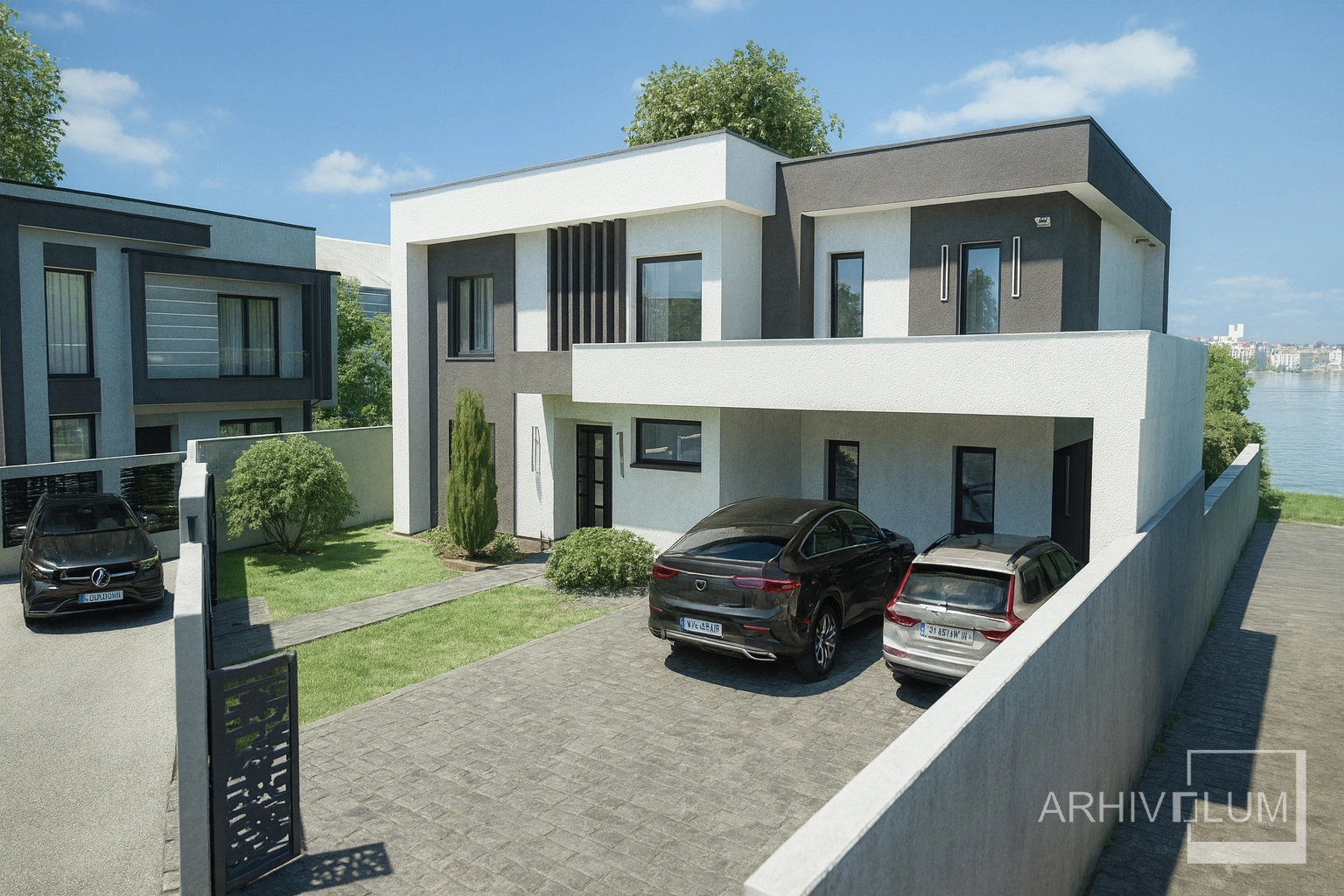 Terenul în ușoară pantă a condus spre o amenajare cu terasamente si amplasarea unei piscine spre malul lacului. Terasa circulabilă, copertinele de beton armat, balcoanele si parcarea deschisă pentru 2 autoturisme susțin acest tip de arhitectură modernă. În suprafața desfășurată nu sunt incluse scarile de la intrare, terasele descoperite de la parter și etaj și copertinele din beton armat. Construcția va fi realizată in anul 2026 si face parte dintr-un mic cartier cu 25 de locuinte.
