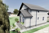 Intrarea în casa cu mansardă este centrală, iar imediat pe partea dreapta avem zona de circulație verticală și baia.